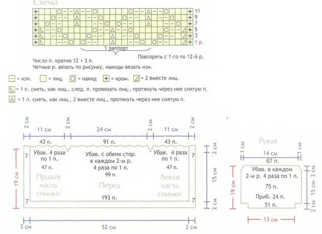 Снять со вспом. спицы п. спинки и вязать, убавляя по линии реглана в кажд. 2-м р. 4 раза по 1 п. и оставить п. на вспом. спице.