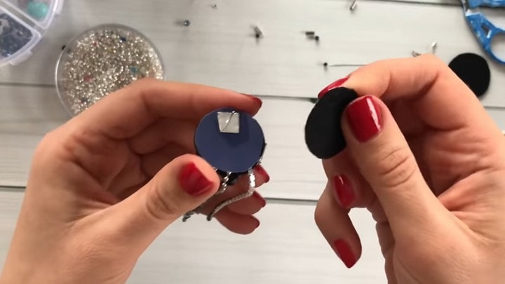 С помощью суперклея зафиксируйте картонный кружок на тыльной стороне фетрового. Затем наклейте заготовку для серёжки-гвоздика. Проделайте иглой или шилом отверстие для штырька во втором фетровом кружке и наклейте и его.