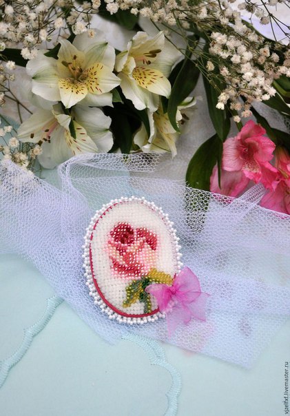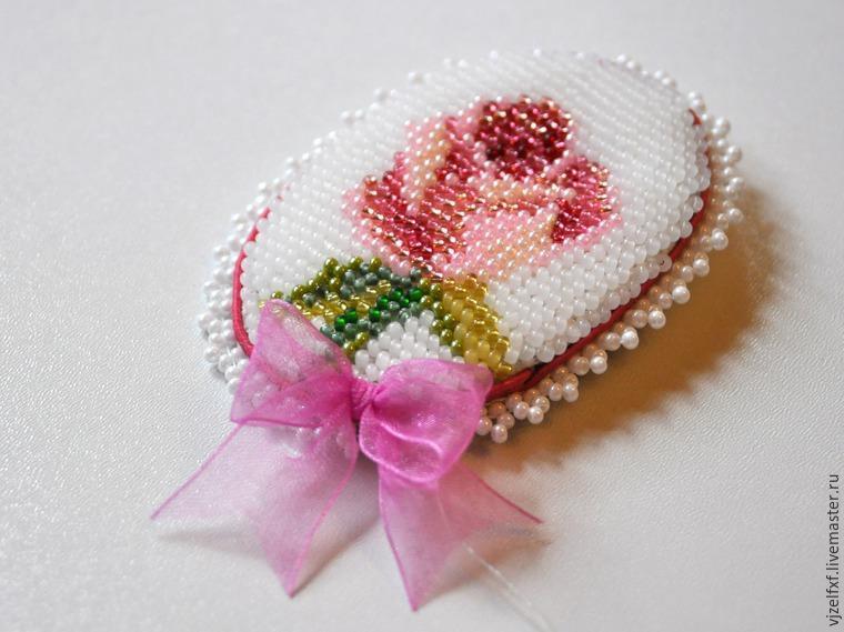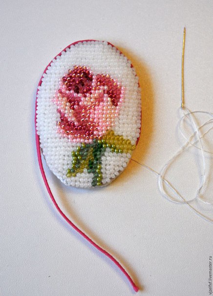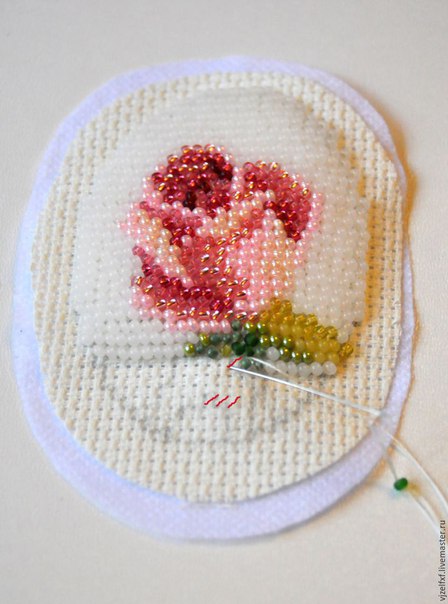 Согласно выбранному рисунку пришиваем бисер, нужного цвета, используя монастырский шов (полукрест).