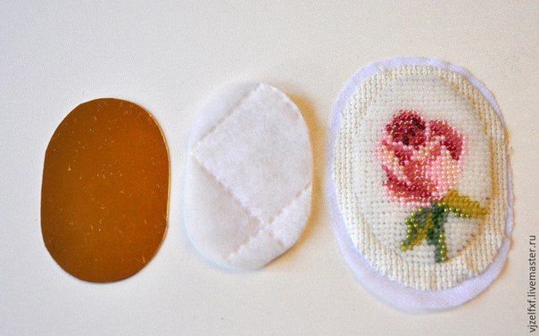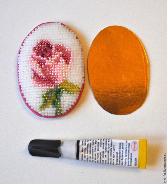 Теперь снова вырезаем картонный овал, только на 2-3 мм меньше уже использованного. Перед тем как клеить проверьте размер, приложив картон к заготовке броши. Аккуратно наносим клей по контуру и приклеиваем его к нашему изделию.