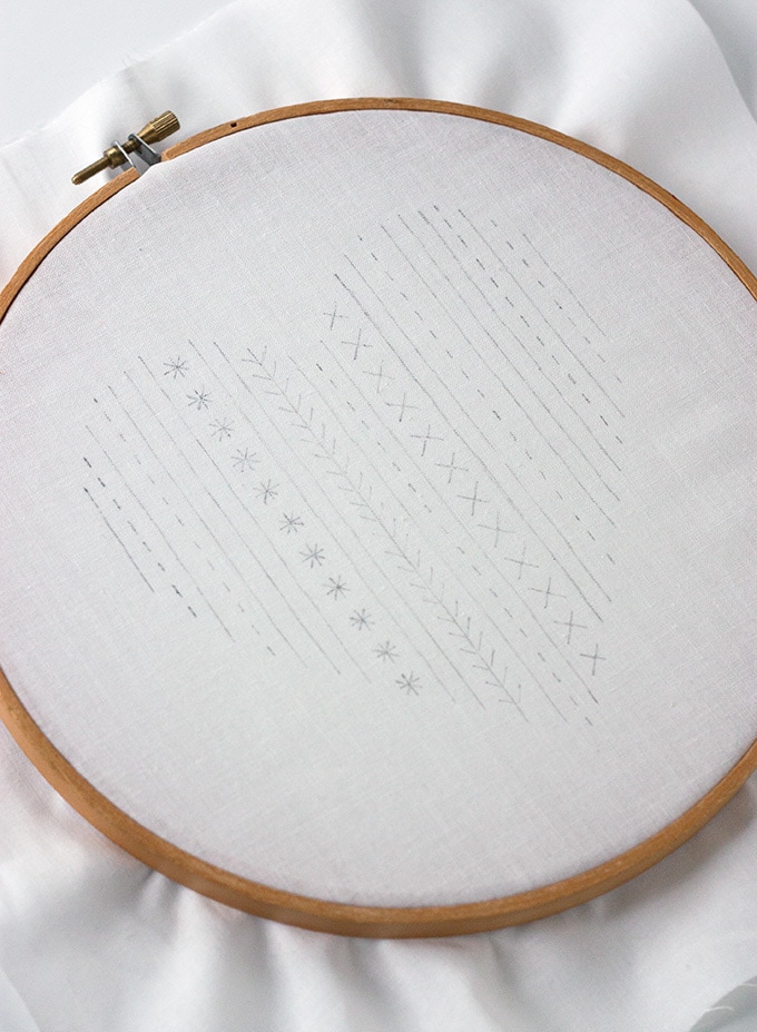 Закрепляем канву или ткань с нанесенным рисунком на пяльцы. Старайтесь подобрать нужный размер, чтобы натяжение ткани было оптимальным.