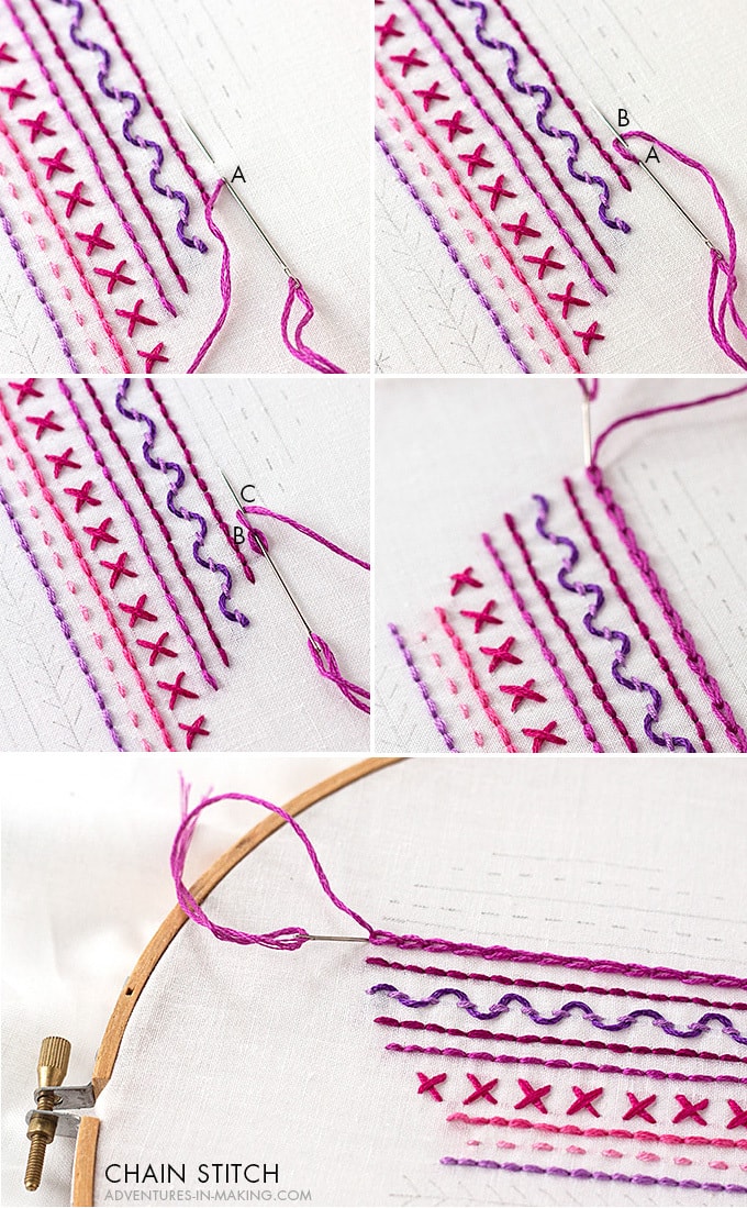 Для образования шва в виде цепочки необходимо формировать петлю на поверхности ткани, а затем фиксировать ее следующей петлей.