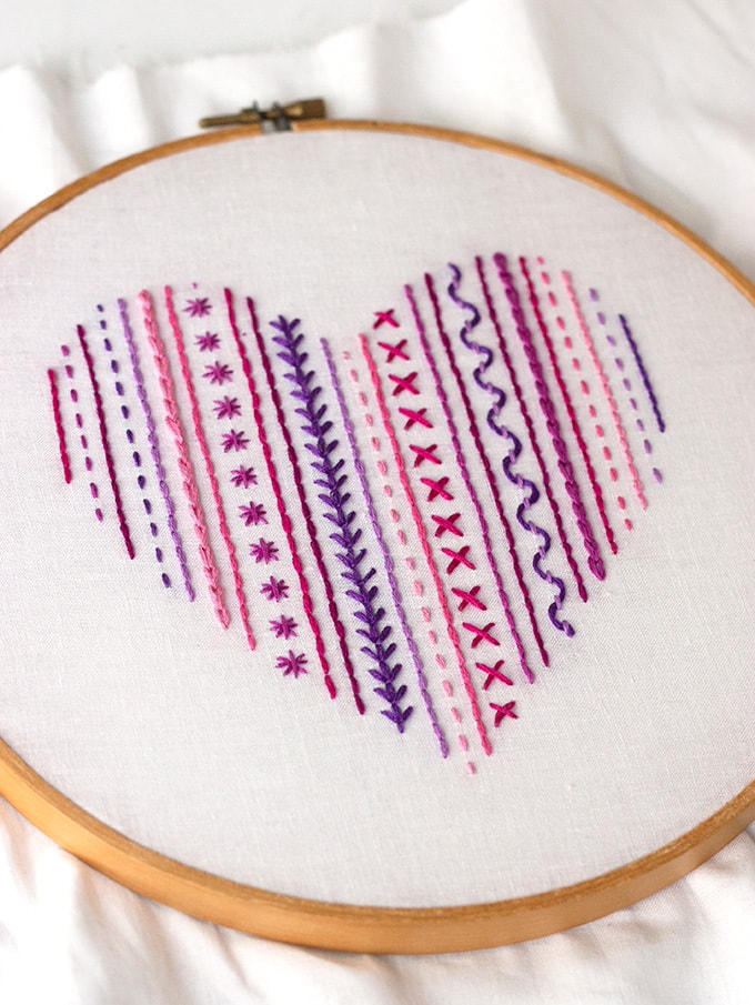 Если у вас есть желание, но нет опыта и лишнего времени, начните знакомство с вышивкой с такого вида поделки как семплер или пробоотборник. Он представляет собой пример различных художественных швов, выполненных цветными нитками. Семплеры часто оформляют в границы определенных фигур. В примере описанном ниже используется сердце.