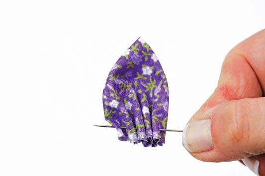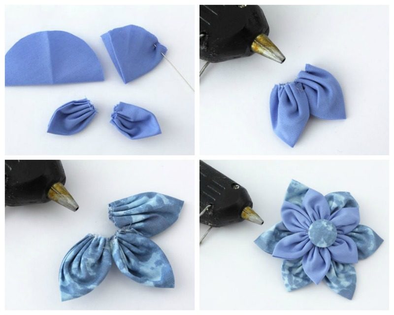 Повторяем предыдущие действия: нарезаем круги из однотонной ткани, дважды складываем пополам и собираем снизу. Проделываем то же самое и с тканью с рисунком, но здесь круги должны быть больше в диаметре в 1,5-2 раза. Собираем цветок: